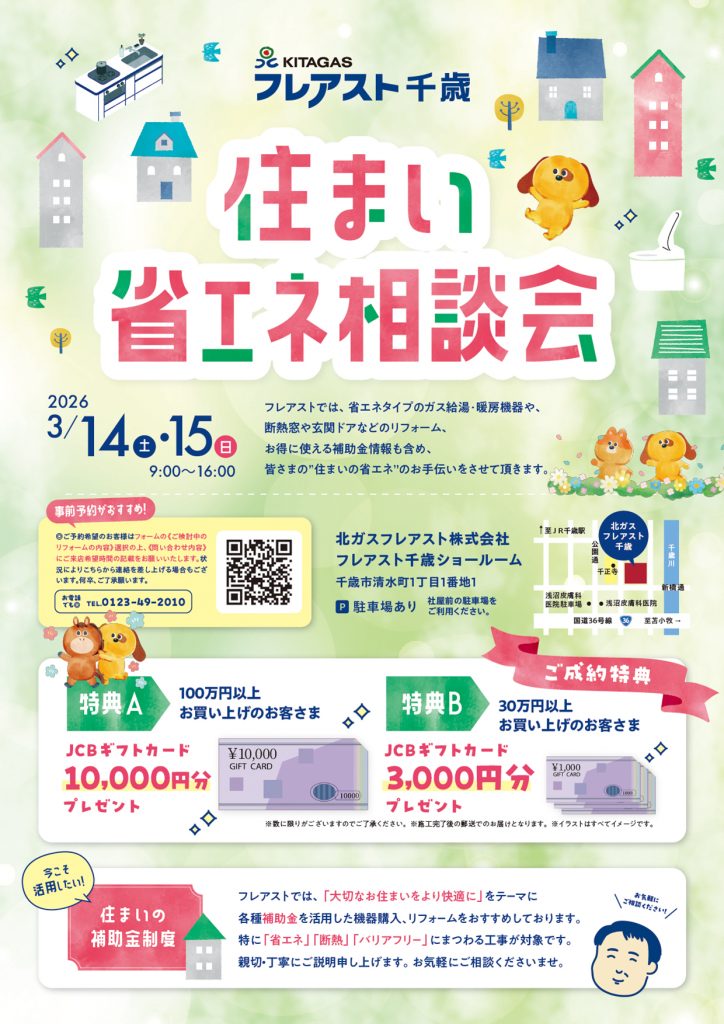 このたび北ガス千歳ショールームにて”住まい省エネ相談会”を開催いたします。